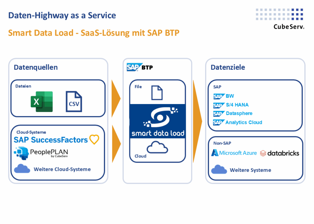 • Direkt & Sicher: Verbinden Sie Cloud-Systeme (z. B. SAP SuccessFactors via API/OData), Excel- oder CSV-Dateien sowie Ihre SAP OnPremise-Systeme nahtlos mit SAP Datasphere, SAP OnPremise-Systemen oder Databricks.